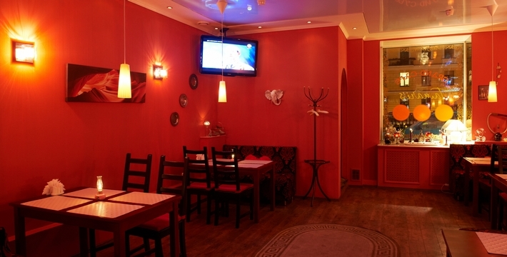 Украшенные приглушёнными софитами своды, атакже алые стены этого заведения визуально увеличивают имеющееся здесь пространство.