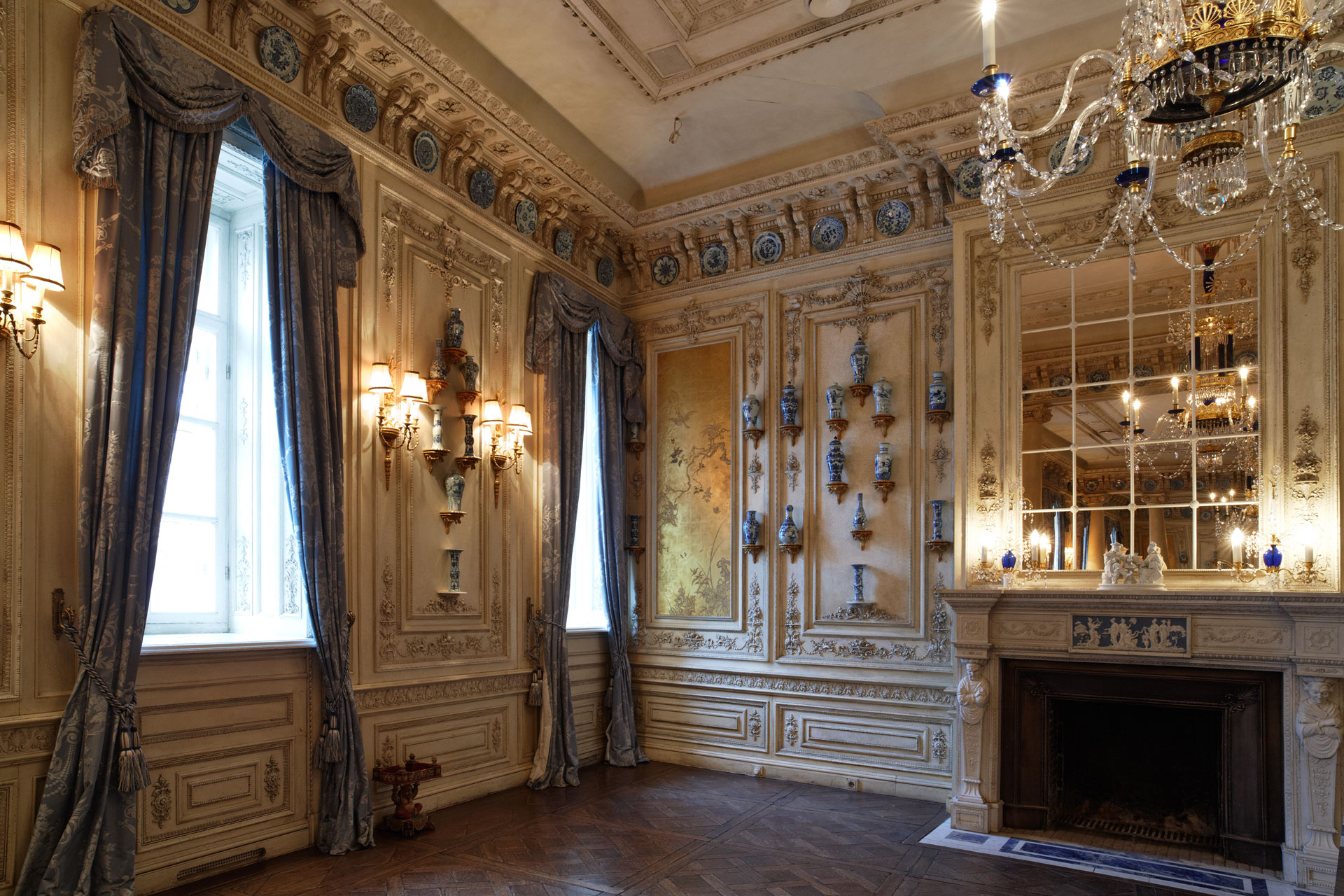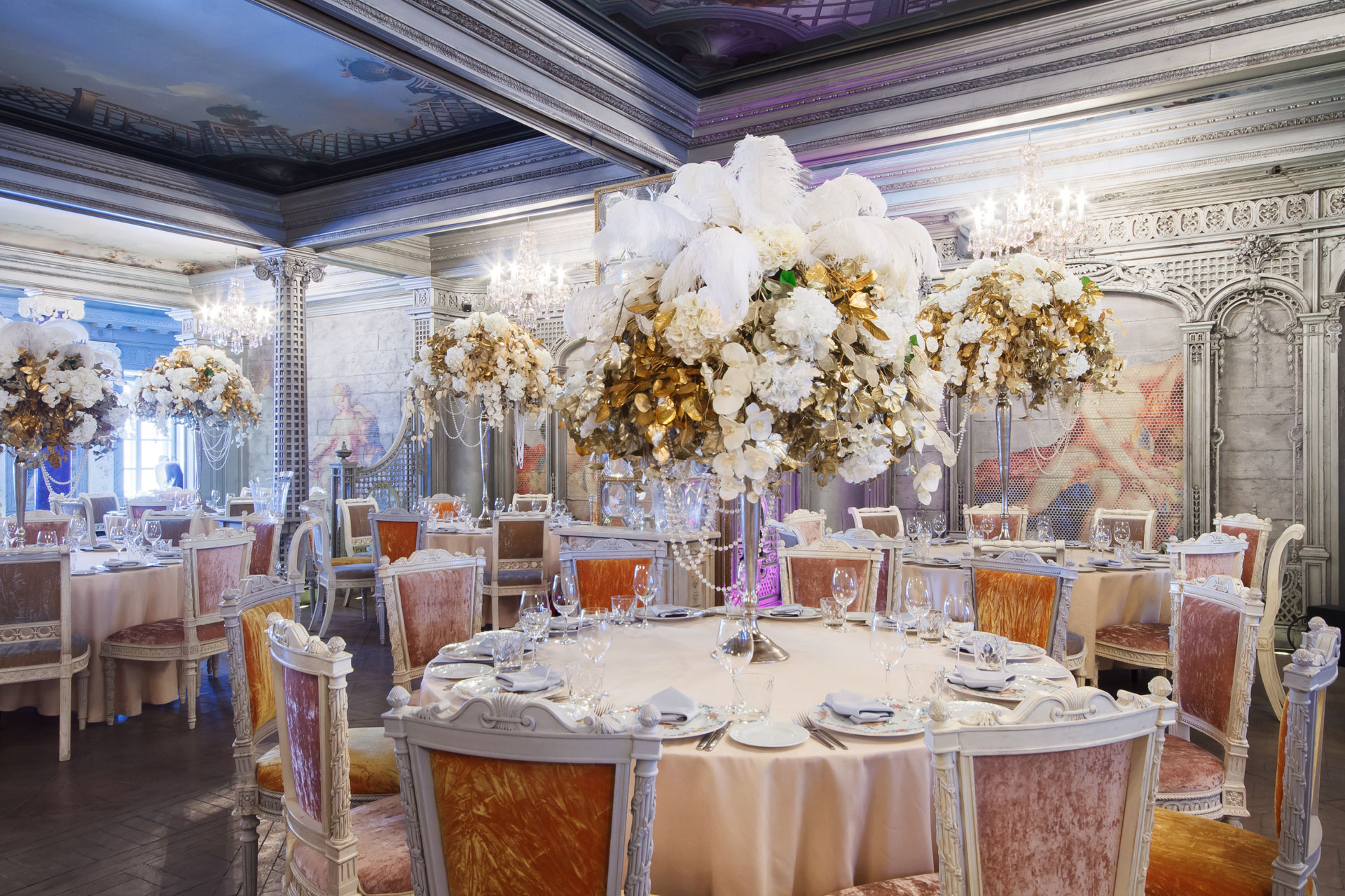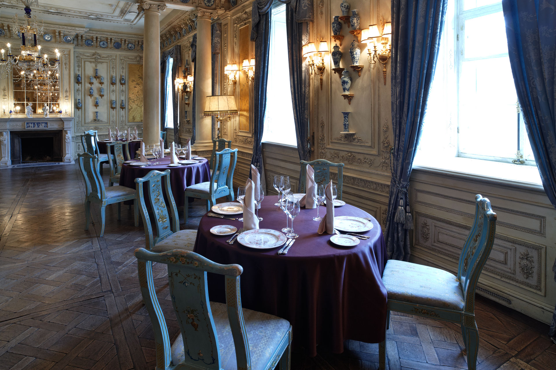 Интерьер ресторана создан в стиле позднего барокко – «шинуазри» (от французского chinois, китайский). Здесь представлены старинные французские гобелены и английские часы, восемь действующих каминов и хрустальная люстра в духе эпохи Людовика XIV, антикварные венецианские зеркала, немецкий фарфор, кованые решетки тульских мастеров-оружейников. Все это гармонично соседствует с барной стойкой из резного стекла, напоминающей футуристический объект или произведение современного искусства.