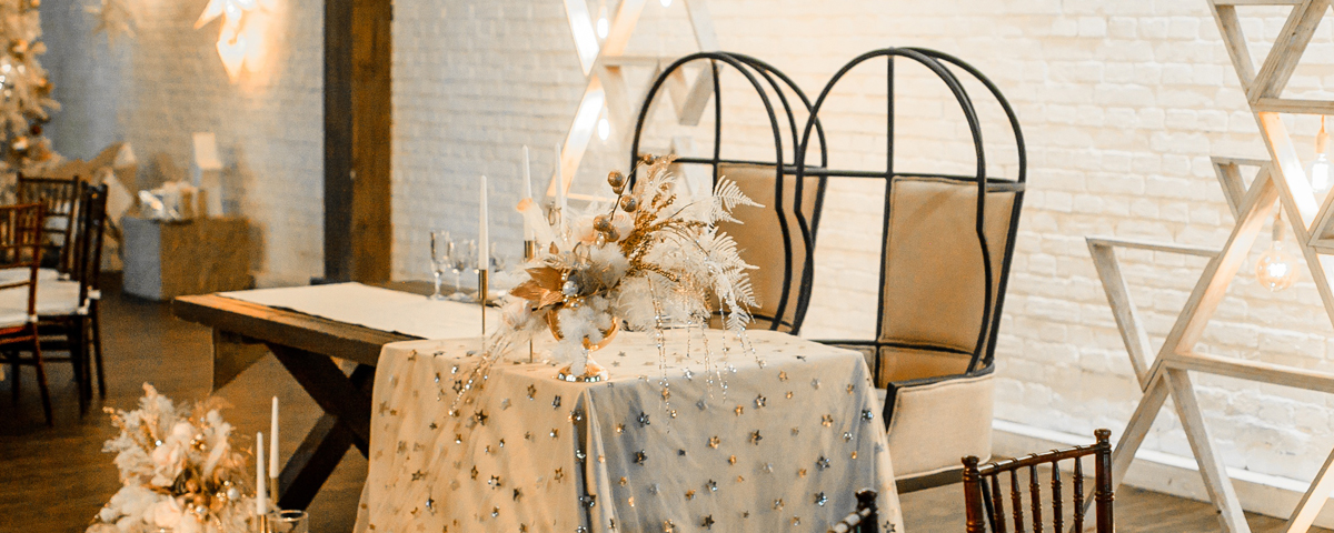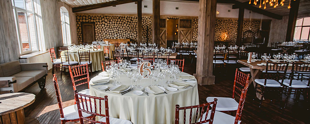 - деревянные прямоугольные столы или столы круглые со скатертью в пол.