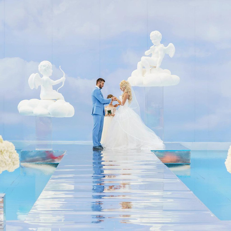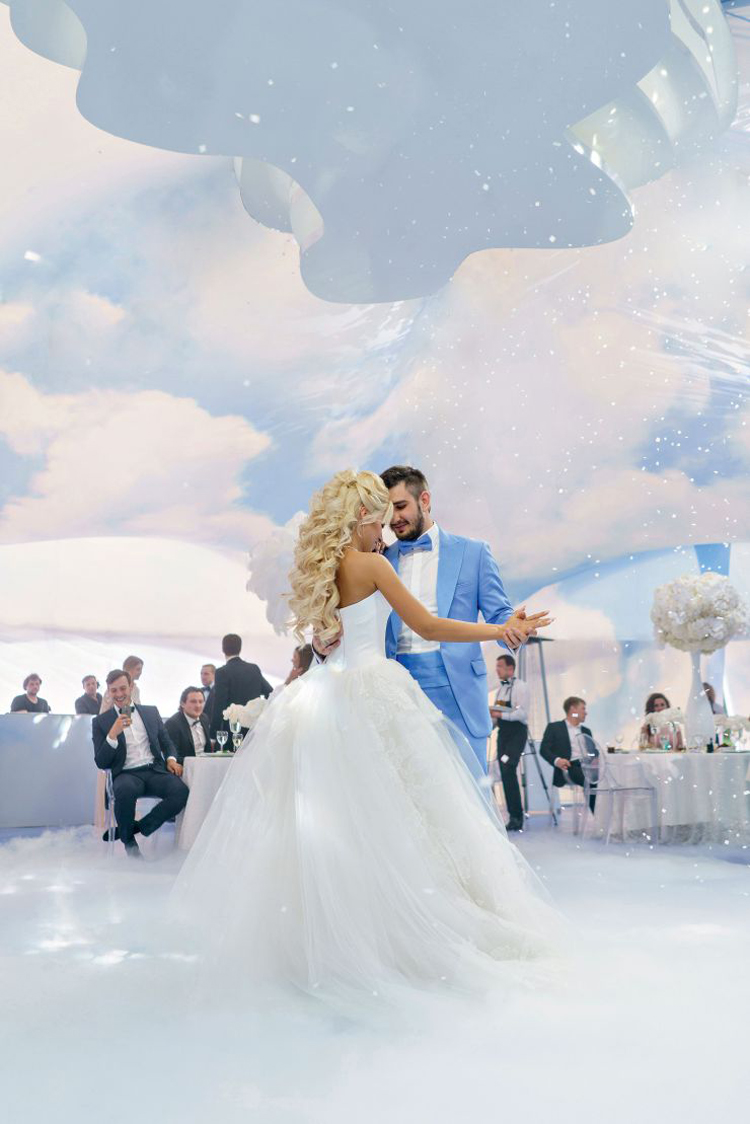 Декорации на свадебной площадке и современные спецэфекты создавали иллюзию, что и гости, и молодожёны находятся на облаках в раю среди летающих ангелов.