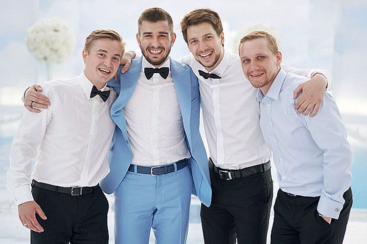 Костюм жениха, насыщенного небесно-голубого цвета, полностью соответствовал общей стилистике торжества.