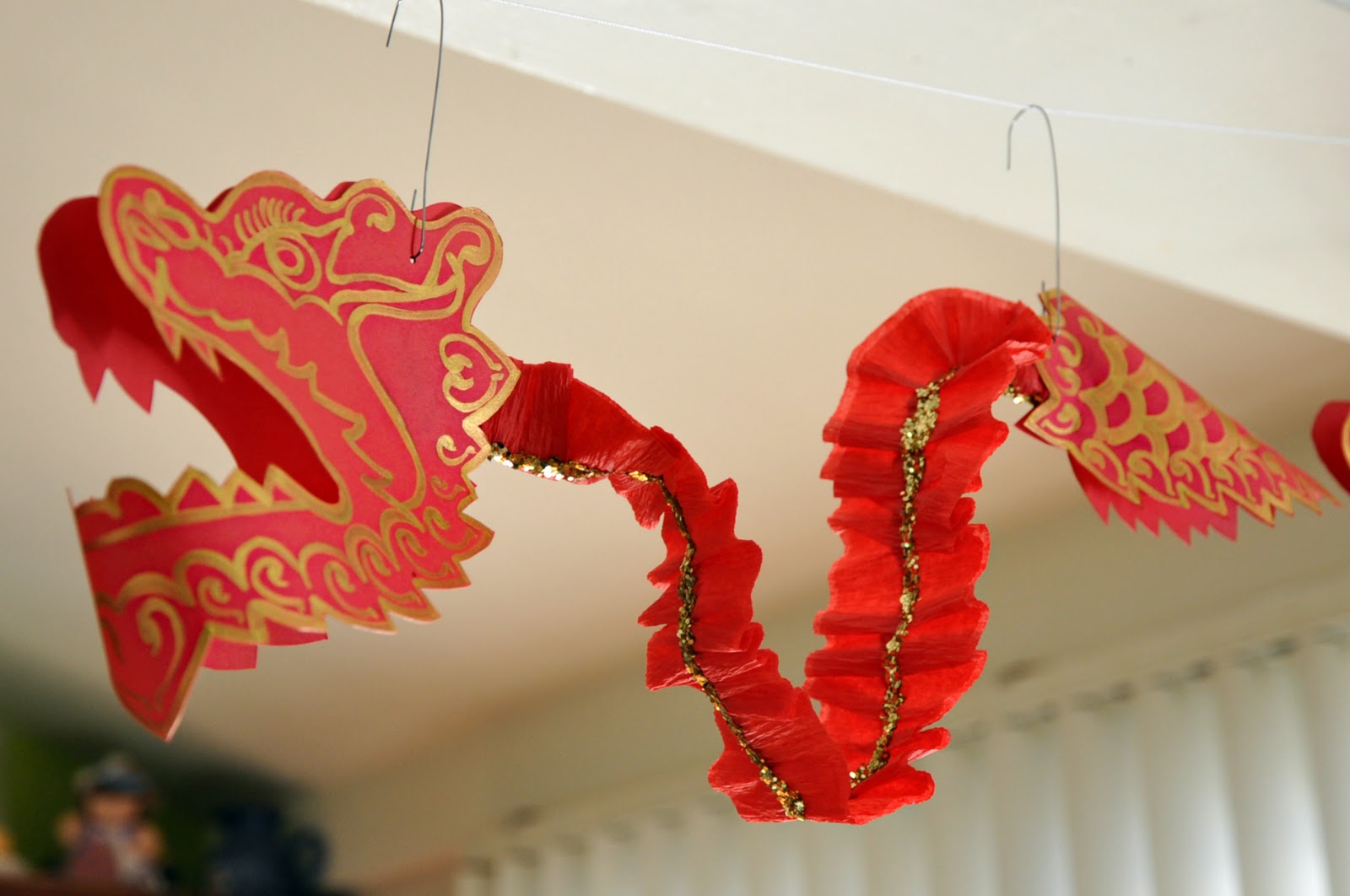 3. Дракон: Пусть символ года будет главным украшением. Большой бумажный дракон, висящий под потолком.