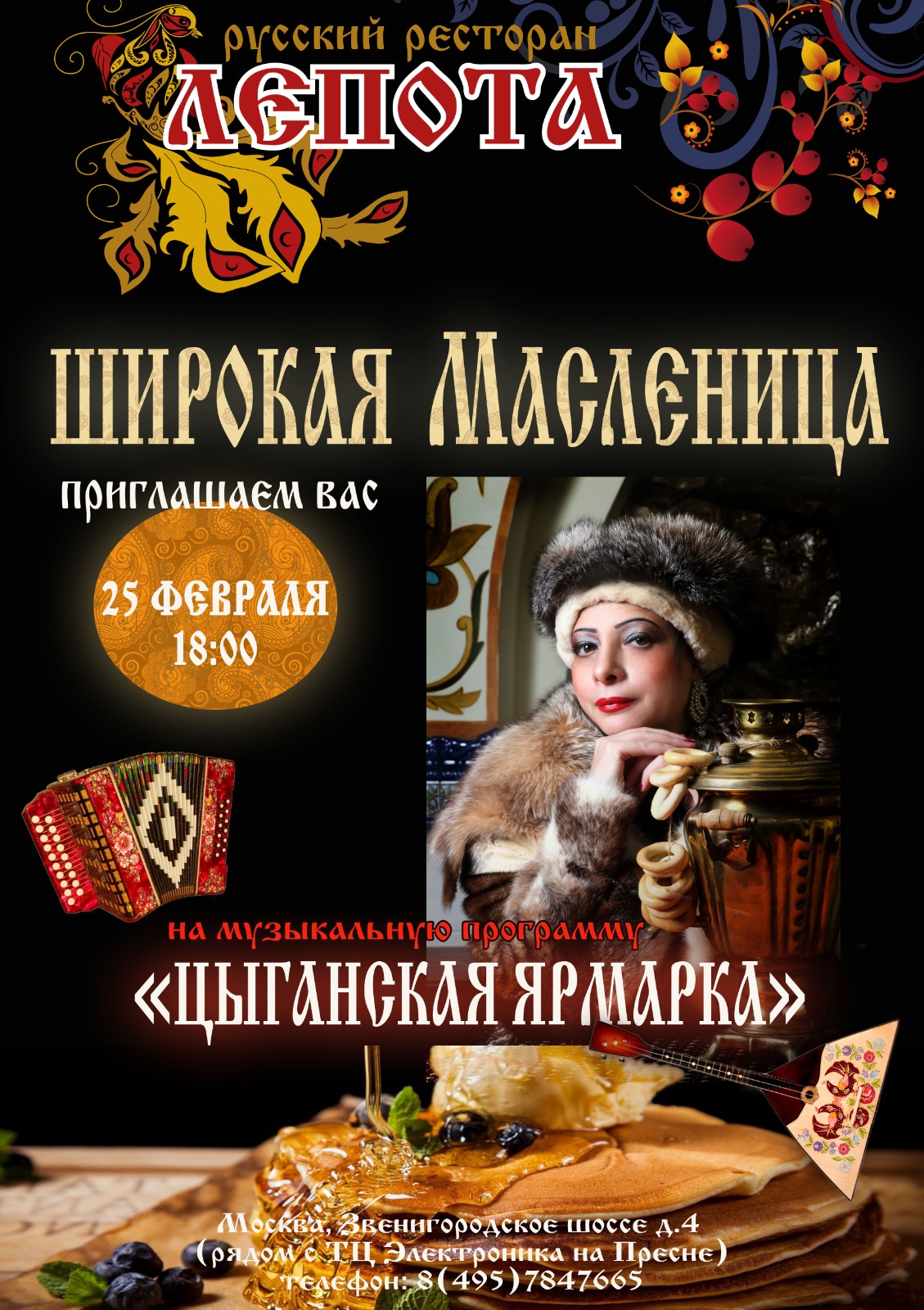 По доброй традиции во многих городских и загородных ресторанах в эти дни в меню появятся блины, блюда с блинами и из блинов, пройдут кулинарные блинные мастер-классы, а также праздничные развлекательные программы на 23 Февраля и «Проводы зимы».
