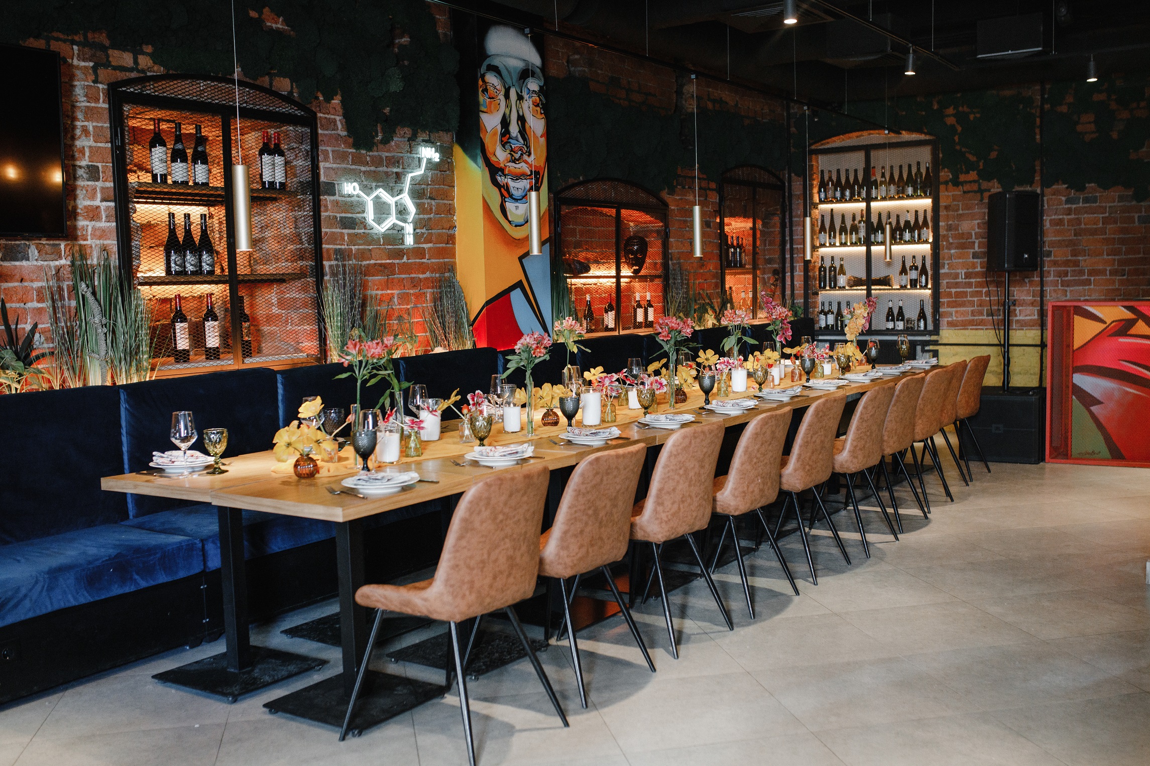 Банкетный зал Zafferano Loft (200 м2) — идеальное место для проведения мероприятий в центре Москвы любого формата и направленности. Интерьер выполнен в модном дизайне ЛОФТ с декоративными элементами в восточном стиле: кирпичные стены, массивная барная стойка, удобные мягкие диваны, большие панорамные окна, много света и живых растений, есть небольшая сцена.