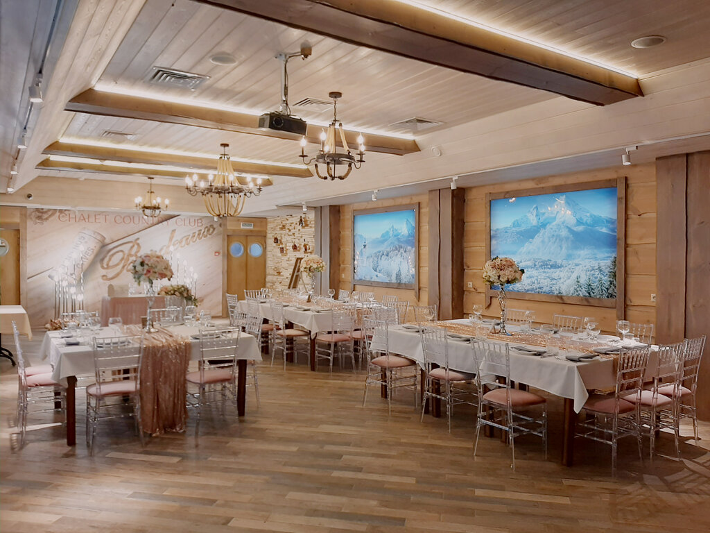 Отель Шале Кантри Клаб формально имеет московский адрес, а по факту является загородным заведением. В отеле частенько проводятся праздничные мероприятия: свадьбы, корпоративы, юбилейные банкеты. Для праздников в отеле предлагаются два зала разной вместимости.