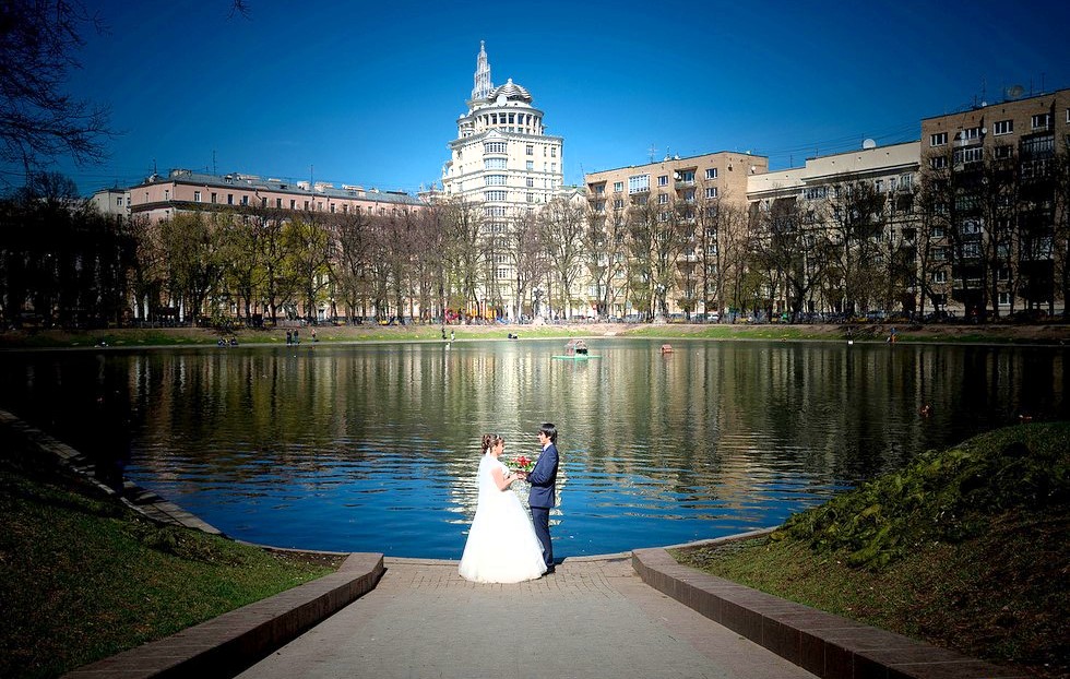 Пресненский район считается одним из самых зелёных в столице, на его территории расположены большие парки и маленькие скверы, в которых можно устроить свадебную фотосессию: