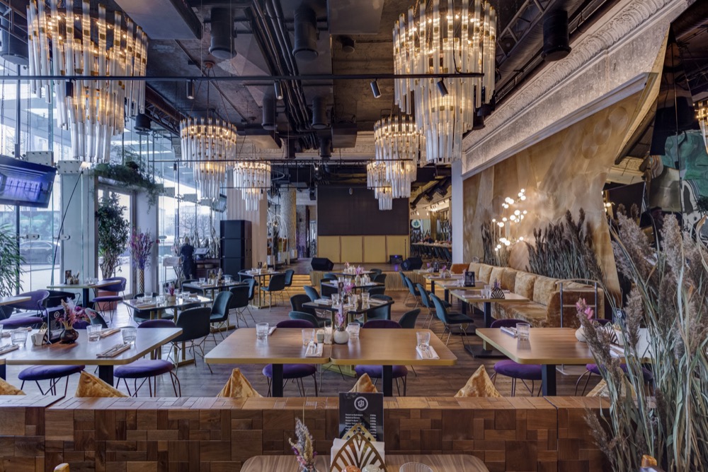 Для банкетов, в том числе свадебных, в ресторане есть элегантный просторный зал со светлым интерьером, большими окнами и шикарными хрустальными люстрами.