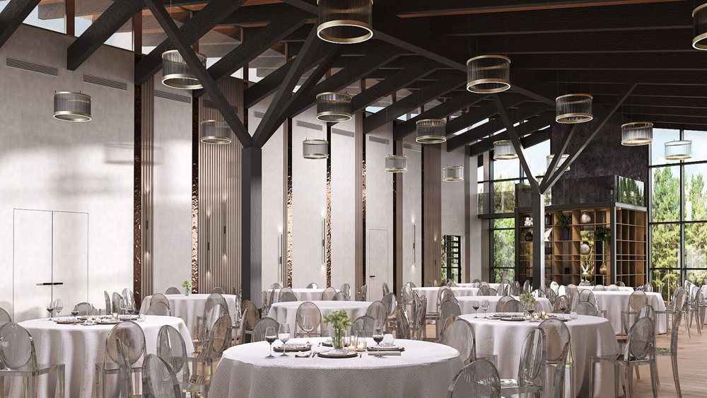 - Главный банкетный зал у озера: Элегантный зал площадью 165 кв. м. с панорамным видом на озеро. Идеально для банкета на 90 гостей.
