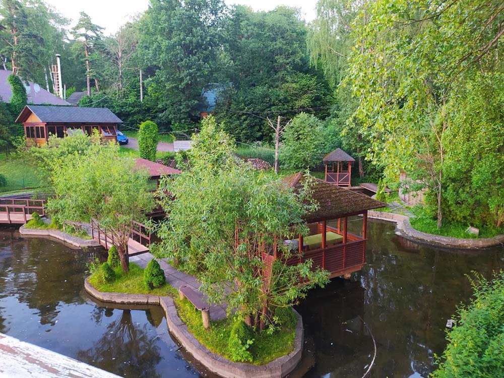 - 12 гектар живописной территории — мосты «Вера, Надежда, Любовь», японский сад, лесные шатры и беседки у воды.