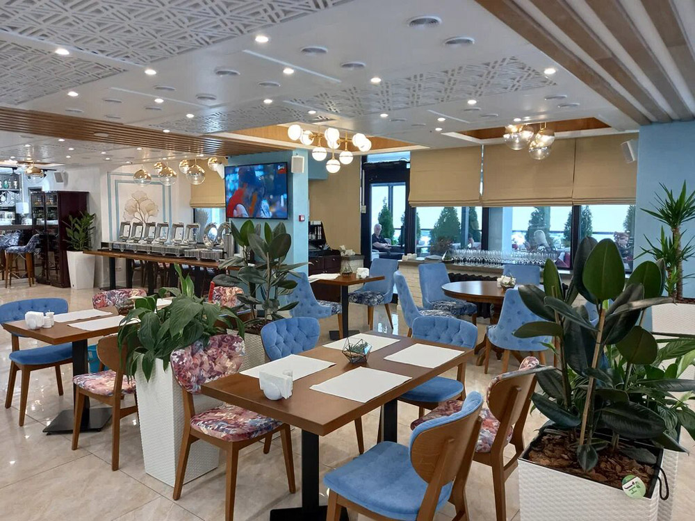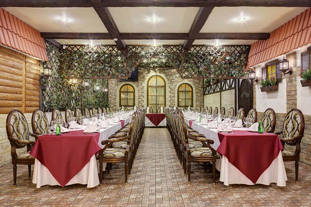 - Просторные залы: Главный зал (140 кв. м.) с выходом на летнюю веранду и Восточный банкетный зал (130 кв. м.) готовы принять до 120 и 100 гостей соответственно.