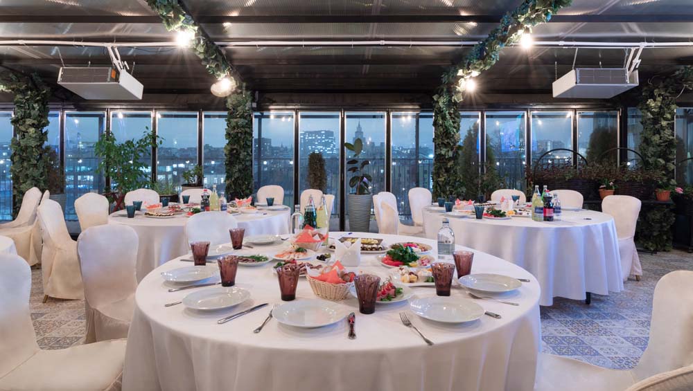Огромные панорамные окна открывают захватывающий вид на город и парк с высоты птичьего полёта, создавая неповторимый фон для Вашего торжества. Здесь каждая деталь продумана до мелочей, чтобы Ваш праздник стал по-настоящему особенным.