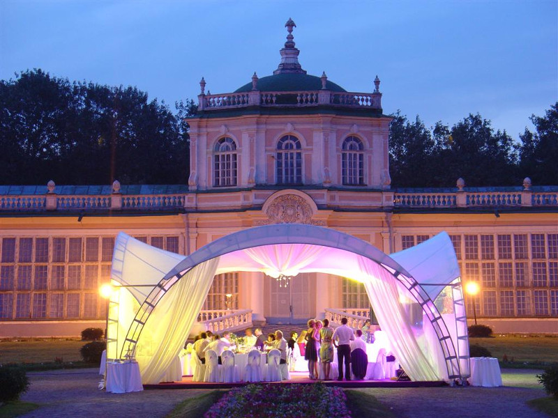 Для свадебного банкета предлагаются несколько залов внутри дворца и шатёр в парке на 150 персон.