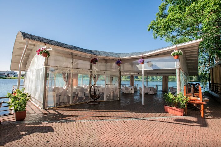 Ресторан Берег — уникальная площадка для свадьбы с выездной регистрацией у воды в живописном парке. С террас и из шатра открывается потрясающий вид на водоём. Есть возможность подойти на яхте. Идеальное место для фотосессии!