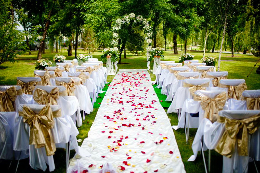 Только представьте: на фоне зелёных деревьев, на зелёной траве белоснежный шатёр или открытая терраса, а внутри весёлая свадьба. Красота!