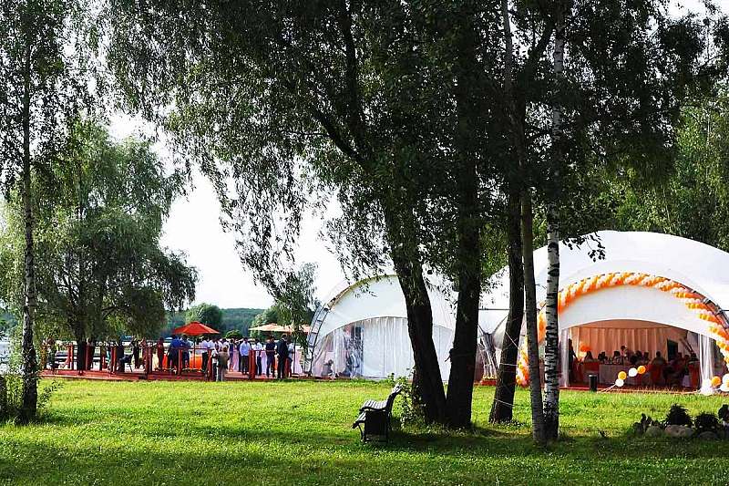 Площадка располагает двумя шатрами, которые вмещают 320 и 200 гостей. Здесь можно устроить оригинальное и веселое праздничное гуляние. Комфортный пляж и возможность аренды катеров внесут свою долю креативности в традиционный свадебный банкет на природе.