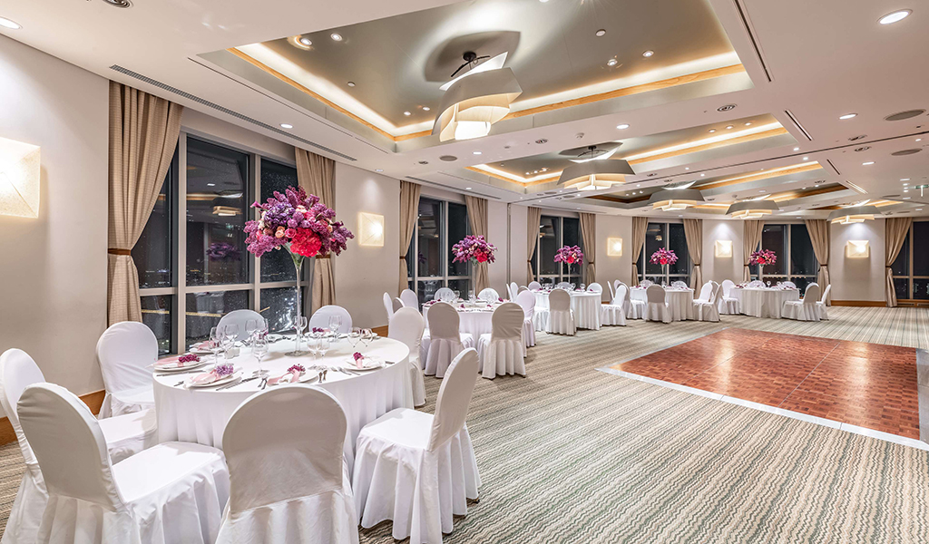 Торжественную выездную регистрацию можно провести на открытом воздухе в парке нашего отеля или на крыше. Для свадебного банкета мы предлагаем 3 шикарных зала на выбор разной вместимости.