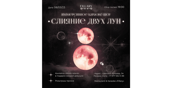 В этот день в Fillary вас ждёт множество приятных сюрпризов - иммерсивное караоке-шоу от наших ведущих и арт группы, подарки от Fillary и наших партнеров, а также комплимент для всех девушек - коктейль Moon Island.
