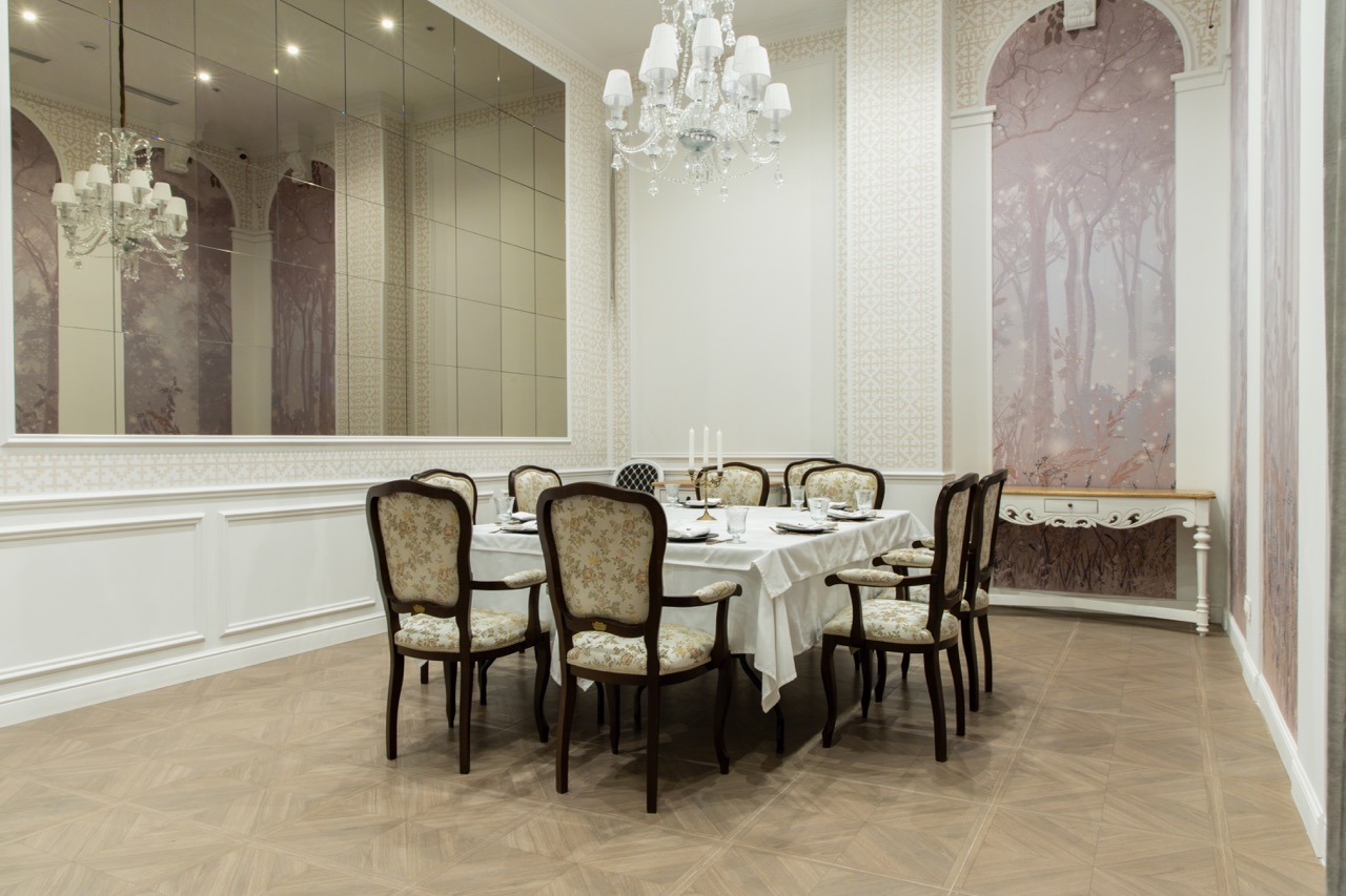 - Основной зал: Если вы хотите погрузить гостей в атмосферу роскоши с элементами барокко, коврами, хрустальными люстрами и копиями работ Марка Шагала.