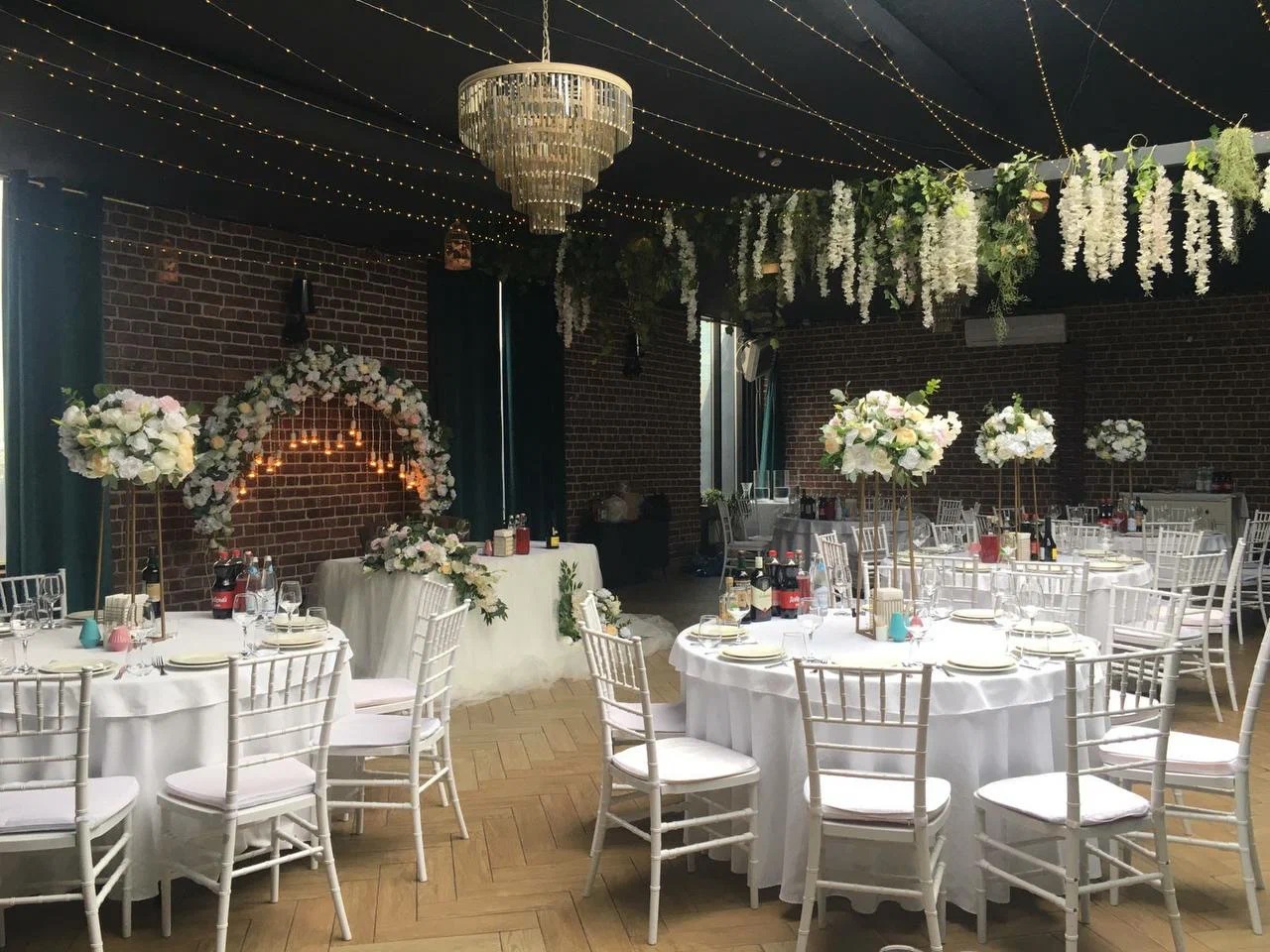 Огромные панорамные окна наполняют зал светом, а специально привезённые из Нью-Йорка хрустальные люстры, на фоне кирпичных стен с арт-объектами, создают потрясающий антураж для ваших фотографий.