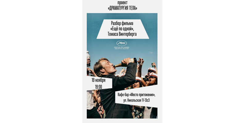 Мероприятие будет необычным и удивляющим. Мы разберём фильм "Ещё по одной" в кафе-баре "Место притяжения" в самом центре Москвы, на м. Площадь Революции, ул Никольская 11-13 с3. 19 ноября, в воскресенье, в 19:00.