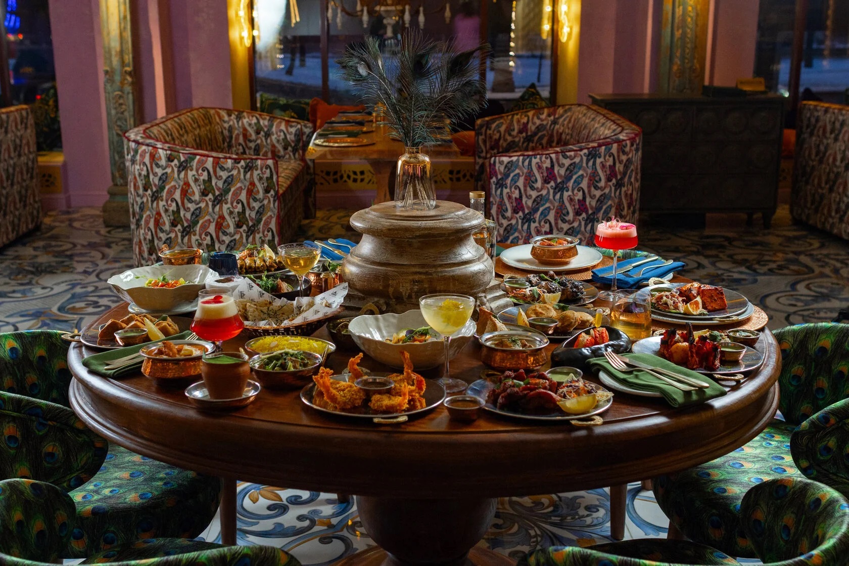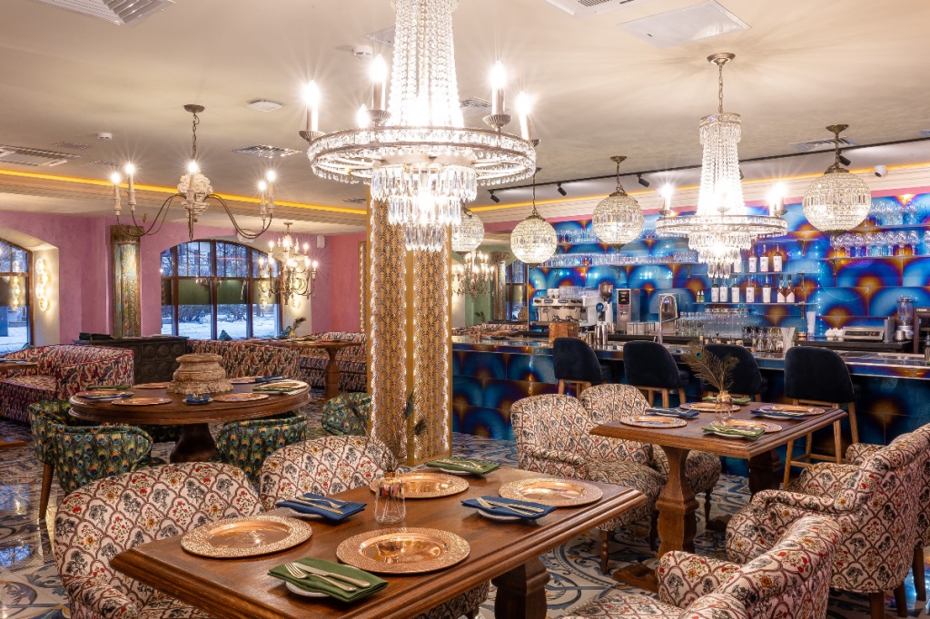 Пространство ресторана сочетает элементы традиционной индийской архитектуры с современным дизайном: тёплые тона, натуральные материалы, богатые текстуры тканей, резьба по дереву и бронзовые элементы создают атмосферу индийской роскоши и уюта.