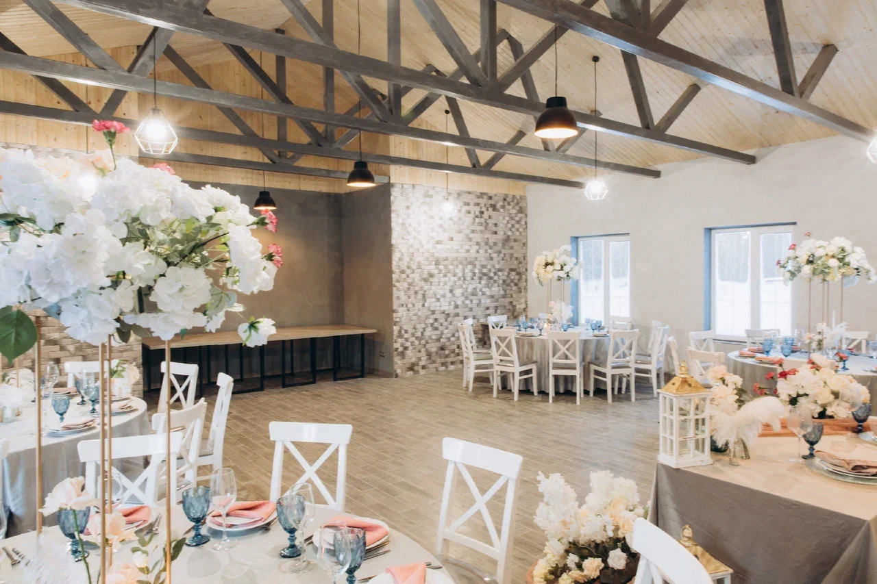 Светлый уютный зал площадью 100 кв метров в стиле лофт вмещает около 40 гостей