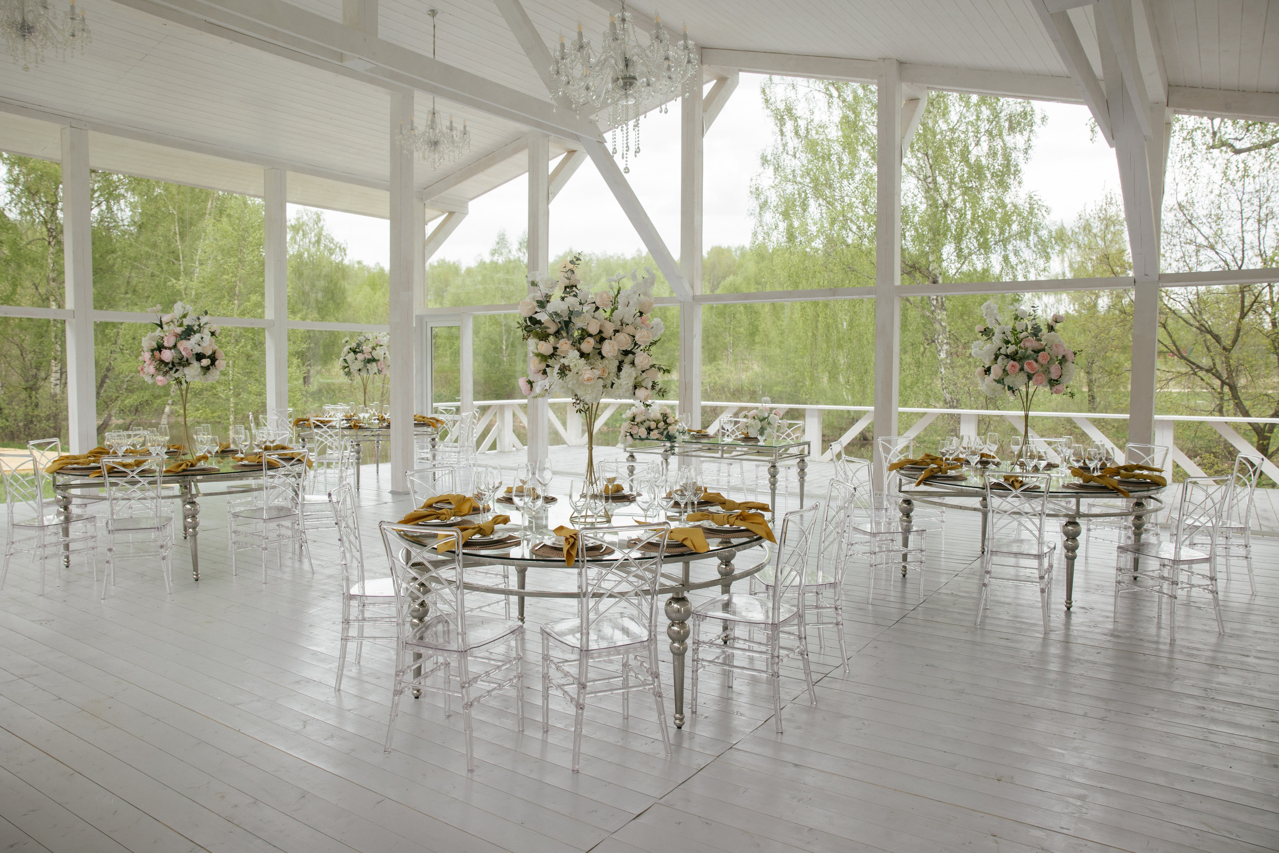 Просторная белоснежная веранда — 70-80 гостей банкетом.
