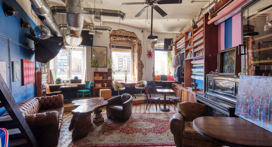В баре создали обстановку «для своих»: уютное двухуровневое помещение с видом на Москву-реку, нарочито обшарпанные бетонные стены, простая домашняя мебель, множество мелочей на полках, приглушенный свет.