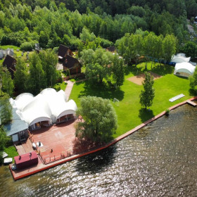 Белоснежный шатер с открытой верандой на берегу водохранилища с великолепным видом на большую воду. Шатёр арочный. Площадь шатра 200 кв. м. (20х10м).